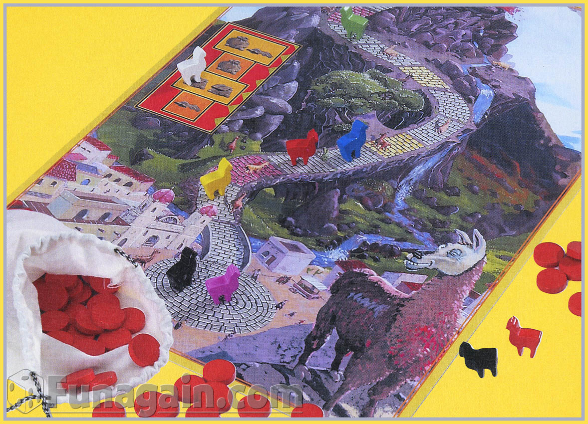 Le sac en toile est rempli de jetons Rouges qui sont des galettes de maïs au piment pour nourrir les Lamas et leur permettre de porter leur lourde charge jusqu’au sommet. A chaque tour de jeu, le premier joueur déclare quelle est la condition de victoire du tour, soit, prendre en secret le plus et/ou le moins de jetons dans le sac, soit en prendre autant qu’un adversaire.