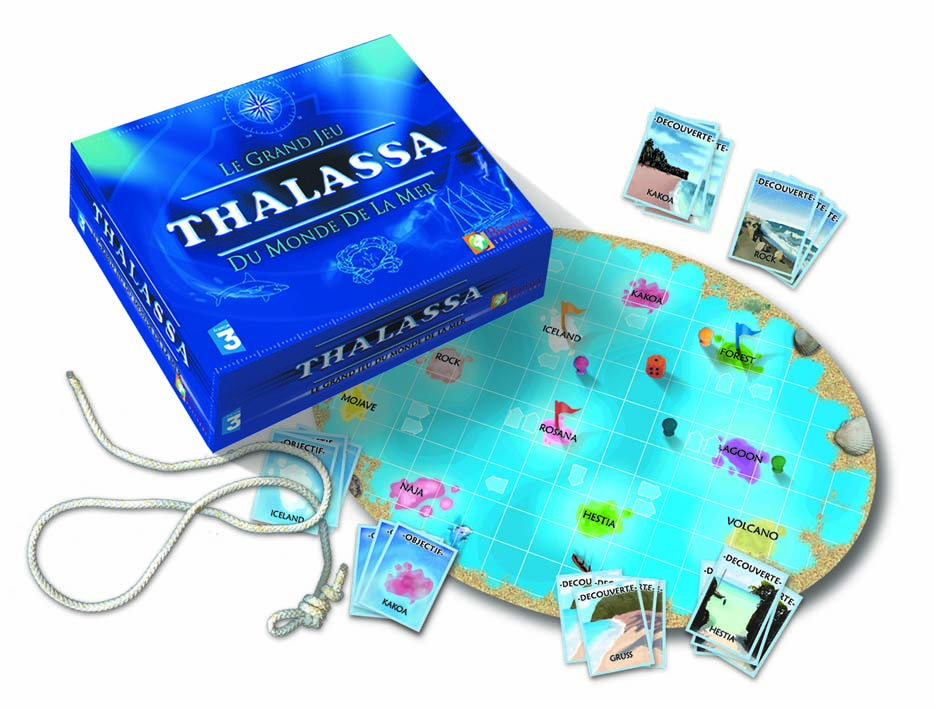 Avec THALASSA, vous embarquez pour un superbe voyage à travers les océans. Tel un grand navigateur, vous explorez les îles inconnues à la recherche des fameuses cartes Découverte. Pour avancer, soufflez sur l’éolienne et vous connaitrez votre vitesse de déplacement. Relevez ensuite le défi des cartes THALASSA, et vous pourrez peut-être récupérer la carte Objectif tant convoitée, indiquant la destination finale. Mais attention, vos adversaires guettent et passent à l’abordage sans prévenir.